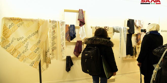 المعروضات تتنوع بين الشالات والأواني الخزفية وأغطية الطاولات والأقمشة وزينت جميعها بالرقوش والمفردات البصرية المأخوذة من الحضارات السورية القديمة وأبجدياتها اللغوية والرمزية.