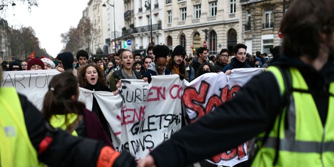 التحركات الاحتجاجية للطلاب الفرنسيين تتزامن مع تزايد حدة احتجاجات “السترات الصفراء” المناهضة لـ ماكرون والتي تطالب بتنحيته عن السلطة بعد أن طفح بهم الكيل من سياساته المتهورة التي أدت إلى غلاء أسعار المعيشة وارتفاع أسعار الوقود وزيادة الضرائب .