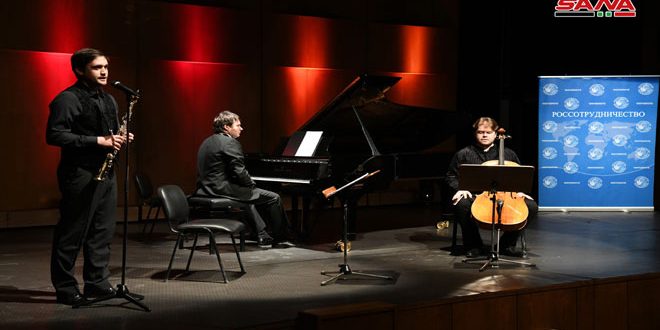 وقدم الموسيقيون دينيس تشيفانوف على آلة البيانو وفيتالي فاتولا على آلة الساكسفون ويفغيني روميانتسيف على آلة التشيلو في الأمسية التي أقامتها وزارة الثقافة بالتعاون مع سفارة روسيا الاتحادية في دمشق أعمالا كلاسيكية لكبار المؤلفين العالميين.