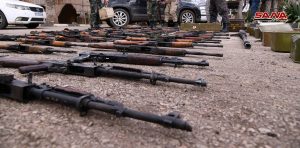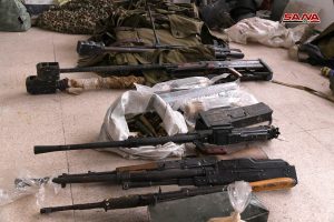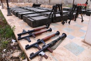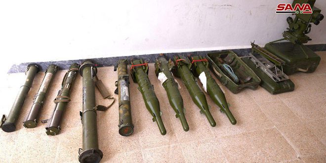 وعثرت الجهات المختصة أمس الاول على كميات كبيرة من الاسلحة والذخيرة بينها صواريخ “تاو” أمريكية الصنع ورشاشات متوسطة عيار 5ر14 مم وقذائف هاون وقذائف دبابات وصواريخ تاو أمريكية الصنع وقذائف عربة بي ام بي وقواذف أر بي جي من مخلفات الإرهابيين في محيط قرية نصيب جنوب شرق مدينة درعا.