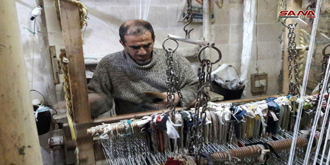 عبد الكريم عكاش حرفي في خان رستم باشا بمدينة حماة يقف خلف نوله الخشبي ساعات طويلة ليمارس مهنته التي تعلمها من والده منذ أكثر من أربعين عاماً ويسعى إلى تعليمها لمن يشاء رغبة منه بالمحافظة عليها.