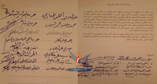 وقعت الأحزاب والمكونات السياسية اليمنية الليلة الماضية على اتفاق يطلب من رئيس الجمهورية عبد ربه منصور هادي ورئيس الوزراء المكلف خالد بحاح تشكيل حكومة كفاءات وطنية وفقا للمعايير المتفق عليها في وثيقة السلم والشراكة الوطنية.