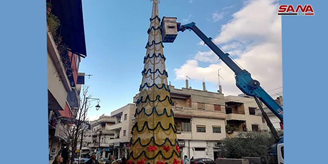 تم اليوم في حي عكرمة بمدينة حمص إضاءة شجرة ميلاد بطول 15 متراً زينت بـ 70 متراً من القماش الذهبي و45 حبلاً من الإضاءة وذلك لأول مرة منذ ست سنوات غابت خلالها أجواء الأعياد بسبب الإرهاب.