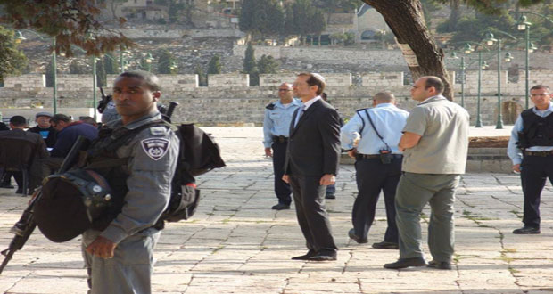 اقتحم نائب رئيس الكنيست الإسرائيلي المتطرف موشيه فيجلين اليوم المسجد الأقصى في تصرف استفزازي تزامن مع حلول ذكرى وعد بلفور المشؤوم في وقت تشدد سلطات الاحتلال الإسرائيلي إجراءاتها أمام المصلين الفلسطينيين بعد أن منعتهم قبل أيام من دخول باحة المسجد في البلدة القديمة بالقدس المحتلة.