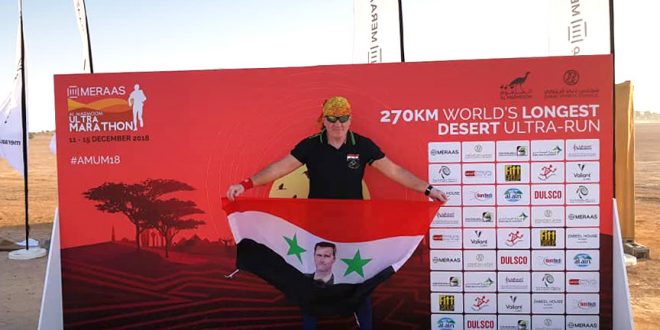 وشارك العداء بركات في البطولة التي أقيمت في محمية المرموم الصحراوية في إمارة دبي لفئة 50 عاما وحقق المركز الثالث ورفع علم سورية عالياً أثناء تتويجه بالميدالية البرونزية.