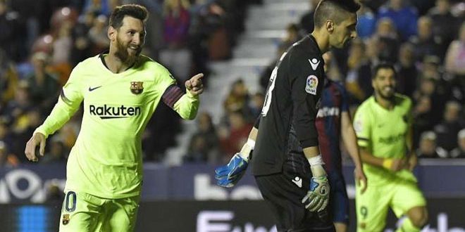 سجل ليونيل ميسي أول ثلاثية له في دوري الدرجة الأولى الإسباني لكرة القدم هذا الموسم وصنع هدفين صانعا لفريقه برشلونة فوزا بخمسة أهداف نظيفة على مستضيفه ليفانتي.