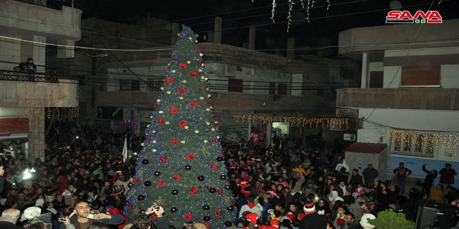 وعمت مظاهر الفرح والسرور ساحة الحفل التي زينت بزينة الأعياد والألعاب النارية ترافقها أغاني الميلاد بمشاركة حشد كبير من أبناء المدينة من مختلف مكوناتهم الاجتماعية وانتمائهم الديني ليجسدوا لوحة جميلة تعبر عن روح الوحدة والتآخي والتآلف والمحبة التي يعيشها جميع أبناء سورية على تراب الوطن الواحد.
