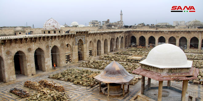 تسير عمليات ترميم الجامع الأموي الكبير في مدينة حلب بخطاً متأنية ودقيقة لتشمل كل حجر فيه طالته يد الإرهاب التي حاولت طمس معالم هذا الصرح الحضاري الأثري الذي صمد بوجه أعتى الزلازل عبر المراحل التي مر بها منذ بنائه.