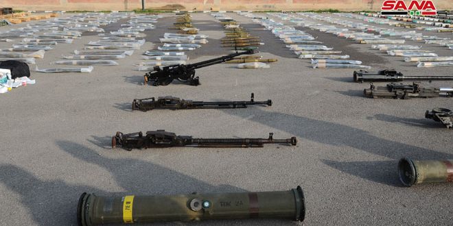 ولفت المصدر إلى أن “الأسلحة المضبوطة شملت صواريخ “تاو” أمريكية الصنع وصواريخ “الفاغوت” التي كانت تستخدمها التنظيمات الإرهابية لاستهداف الطيران والعتاد المدرع إضافة إلى أنواع أخرى من الأسلحة الخفيفة والمتوسطة والثقيلة وكميات كبيرة من ذخائر الـ “م د” والـ “م ط” وذخائر الرشاشات معظمها صناعة أمريكية وغربية” وأضاف المصدر: أن من بين ما تم العثور عليه أيضا قواذف آر بي جي متعددة الأعيرة” والرشاشات التي تستخدم للرمي على الطيران والدبابات وقذائف المدفعية والقذائف الصاروخية بمختلف الأعيرة التي كانت تستخدم في الاعتداء على نقاط الجيش العربي السوري والمدنيين والأبنية السكنية”.