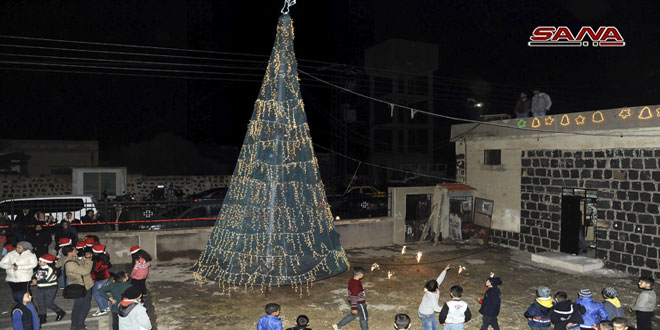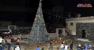 بمناسبة عيد الميلاد المجيد تمت في بلدة بصير بريف درعا الشمالي الغربي إضاءة شجرة الميلاد وسط ساحة كنيسة القديس جوارجيوس للروم الملكيين الكاثوليك بطول 15 مترا وافتتاح مغارة جوارها وسط أجواء من الفرحة والبهجة.