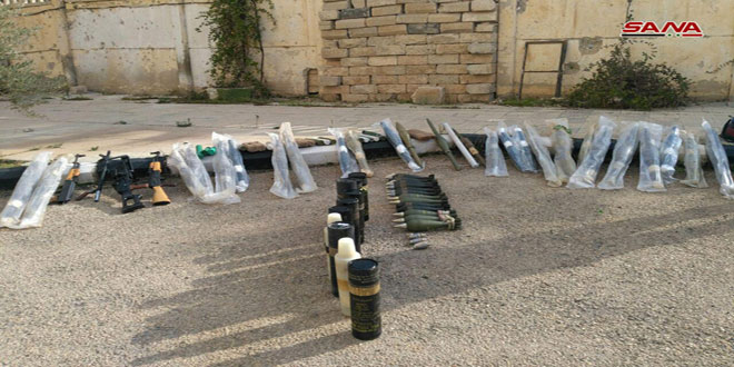 وذكرت مراسلة سانا أن “المضبوطات شملت بنادق حربية ورشاشات إضافة إلى قواذف “أر بي جي” وقذائف هاون متنوعة”.