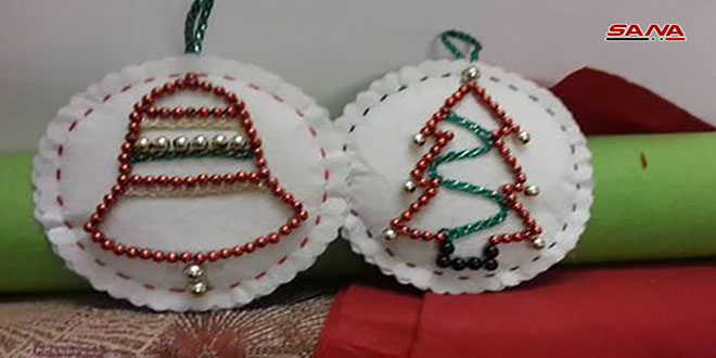 مجموعة من القطع الفنية والأشغال اليدوية بألوان زاهية خاصة بأعياد الميلاد تستعد “هالة غنام” لتسليمها لزبائنها بعد أن حضرتها في منزلها بناء على طلبهم.
