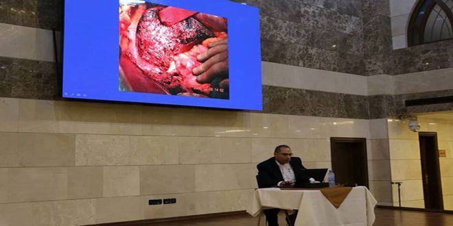 وقال حروب في تصريح لـ سانا:”بعد تشخيص المرض بشكل دقيق أجرينا عملية جراحية معقدة لمريض لديه ورم مخاطي كاذب في الزائدة الدودية ومنتشر في البطن بنحو 7 ليترات من الجيل المخاطي كما أنه متشبث بالأعضاء الداخلية للمريض في منطقة البطن ما أدى إلى تخريبها”.