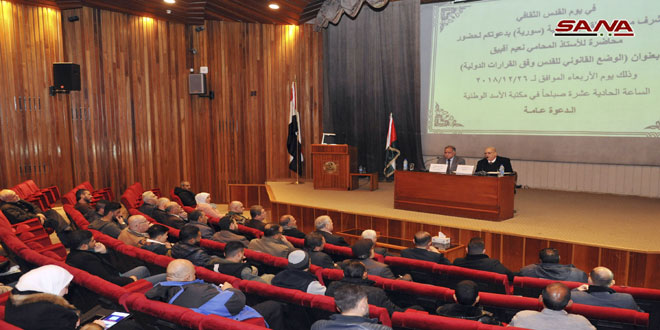 جاء ذلك خلال محاضرة نظمتها مؤسسة القدس الدولية سورية اليوم بعنوان الوضع القانوني للقدس وفق القرارات الدولية في مكتبة الأسد الوطنية بدمشق حيث أشار المحاضر أقبيق إلى أن محور المقاومة يقدم اليوم جهدا كبيرا في القضية الفلسطينية لافتا في هذا السياق إلى أن القرار الدولي 478 الصادر عن مجلس الأمن عام 1980 يحظر على جميع الدول نقل بعثاتها الدبلوماسية إلى مدينة القدس المحتلة.