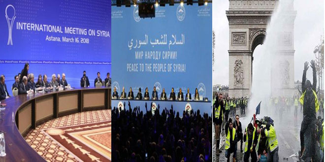 شهد العام 2018 العديد من الأحداث والتطورات المختلفة على الساحتين العربية والدولية من بينها انعقاد مؤتمر الحوار الوطني السوري في مدينة سوتشي الروسية وعقد عدة جولات بشأن الحل في سورية في العاصمة الكازاخية أستانا وفيينا وسوتشي إضافة إلى إجراء انتخابات رئاسية وبرلمانية في كل من روسيا ولبنان والعراق وفنزويلا ومظاهرات احتجاجية في فرنسا.