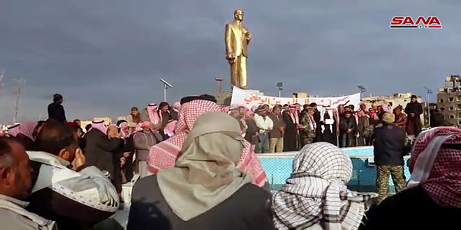بدوره شدد عبد الله السطام من منطقة شرق الفرات على أن “سورية تعيش في ظل وحدة وطنية متينة وجميع أبناء الوطن يرفضون أي عدوان أو التهديد به من قبل النظام التركي” موجها التحية لأبطال الجيش الذين حققوا نصراً جديداً بدخولهم مدينة منبج.