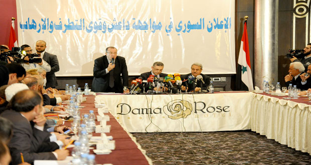 وقعت اليوم قوى سياسية ومدنية في الداخل السوري على “الإعلان السوري في مواجهة داعش وقوى التطرف والإرهاب” وذلك في فندق الداماروز بدمشق.