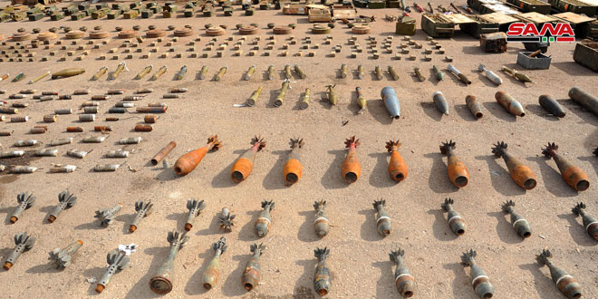 ومنذ تطهيرها من الإرهاب بفضل بطولات وتضحيات الجيش العربي السوري تعمل الجهات المختصة بالتعاون مع وحدات الجيش على تأمين المناطق المحررة من خلال تمشيطها حيث عثرت على كميات كبيرة من الأسلحة والذخيرة بعضها إسرائيلية وأمريكية المنشأ وادوية وسيارات شحن كبيرة وسيارات إسعاف غربية الصنع ما يعكس حجم الدعم اللوجستي والتسليحي للتنظيمات الارهابية من الدول الداعمة والراعية لإرهابها.