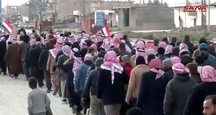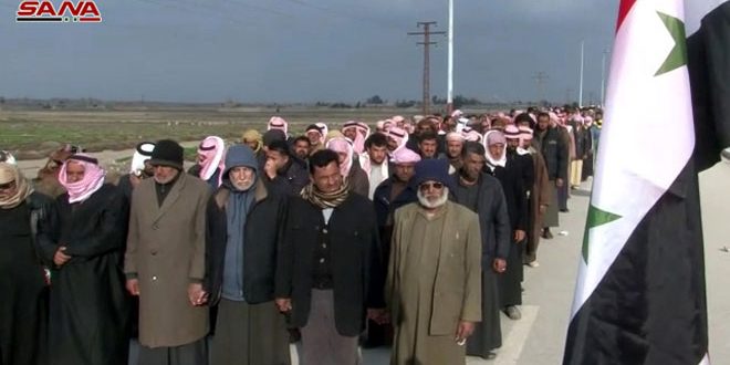 عاد نحو 300 شخص من أهالي دير الزور عبر ممر الصالحية اليوم إلى قراهم وبلداتهم التي تهجروا منها بفعل اعتداءات تنظيم “داعش” الإرهابي من ضمنهم العشرات من العسكريين الفارين أو المتخلفين عن الخدمة الإلزامية من أبناء المحافظة تمت تسوية أوضاعهم مستفيدين من مرسوم العفو تمهيداً للالتحاق بالقطعات والتشكيلات العسكرية وذلك وسط احتفال جماهيري أقيم في قرية الصالحية بمشاركة فعاليات شعبية وأهلية.