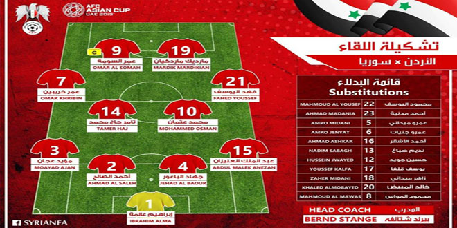 أعلن مدرب منتخب سورية الوطني لكرة القدم الألماني بيرند شتانغه قائمة لاعبي المنتخب الذي سيخوض المباراة اليوم أمام المنتخب الأردني ضمن منافسات الجولة الثانية للمجموعة الثانية في نهائيات آسيا.