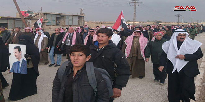 وأشار محمد حسين الجدعان نائب رئيس الهيئة الشعبية للسلام والمصالحة الوطنية في المنطقة الشرقية في تصريح لمراسل سانا إلى أن المهجرين العائدين إلى قراهم والملتحقين بقطعاتهم العسكرية بعد تسوية أوضاعهم من المستفيدين من مرسوم العفو عادوا الى كنف الدولة السورية التي تشكل خيارهم الوحيد الضامن للأمن والاستقرار.