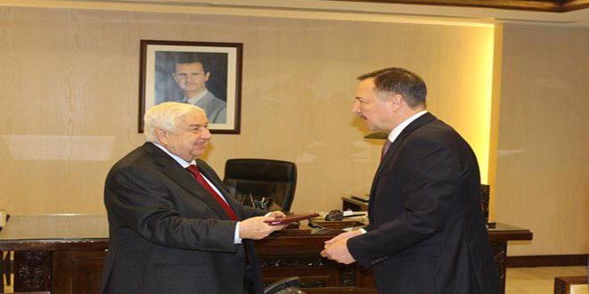 تسلم نائب رئيس مجلس الوزراء وزير الخارجية والمغتربين وليد المعلم خلال استقباله ألكساندر يفيموف سفير روسيا الاتحادية صباح اليوم نسخة عن أوراق اعتماده سفيرا مفوضا وفوق العادة لروسيا الاتحادية لدى الجمهورية العربية السورية.