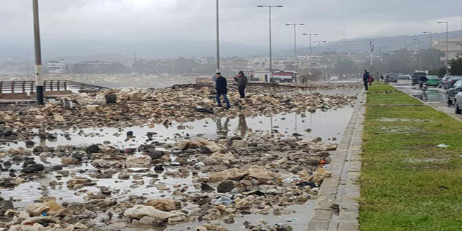 أدى ارتفاع موج البحر جراء العاصفة المطرية التي ضربت محافظة طرطوس اليوم إلى إحداث أضرار في الكورنيش البحري الجنوبي لمدينة بانياس وتخريب جزء منه.