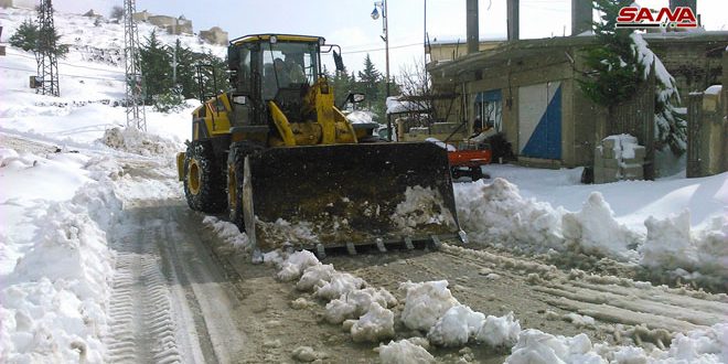 تواصل آليات محافظة القنيطرة إزالة الثلوج وفتح الطرقات في قرى القطاع الشمالي للمحافظة.