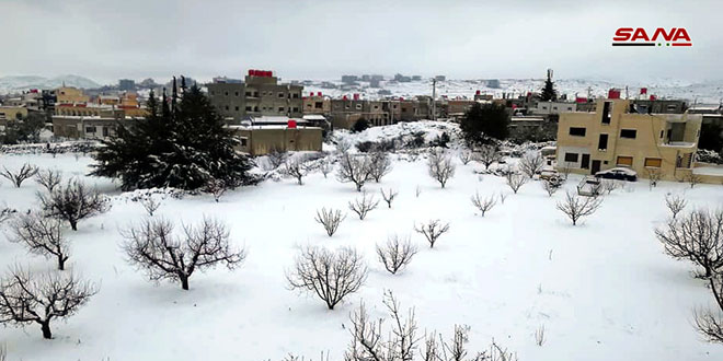 السويداء-سانا غطت الثلوج خلال الساعات الماضية المناطق المرتفعة بالسويداء، وأدت لحدوث تراكمات بسماكات متفاوتة