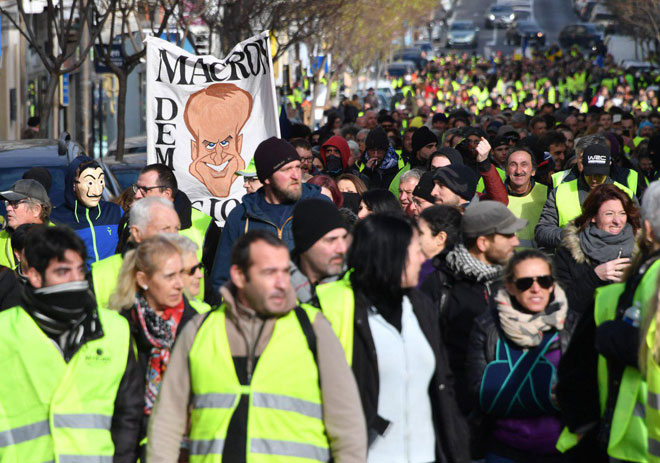 وبدأت احتجاجات (السترات الصفراء) في تشرين الثاني الماضي تعبيراً عن رفض الزيادات في ضريبة الوقود ثم تحولت إلى احتجاج على السياسات الاقتصادية التي يطبقها ماكرون وصولاً إلى المطالبة باستقالته.