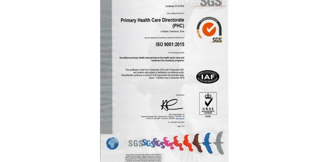 حصلت مديرية الرعاية الصحية الأولية في وزارة الصحة على شهادة الأيزو 9001-2015 بعد نجاحها في اجتياز مرحلتي اختبار لتكون حسب القائمين