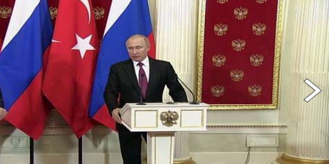 وقال بوتين خلال مؤتمر صحفي مع رئيس النظام التركي رجب طيب أردوغان في موسكو اليوم: تمت مناقشة أفق التسوية السياسية للأزمة في سورية وموقفنا ثابت وراسخ في هذا الشأن وعلينا العمل وفق القرار الأممي رقم 2254 وعلى أساس احترام سيادة ووحدة الأراضي السورية.