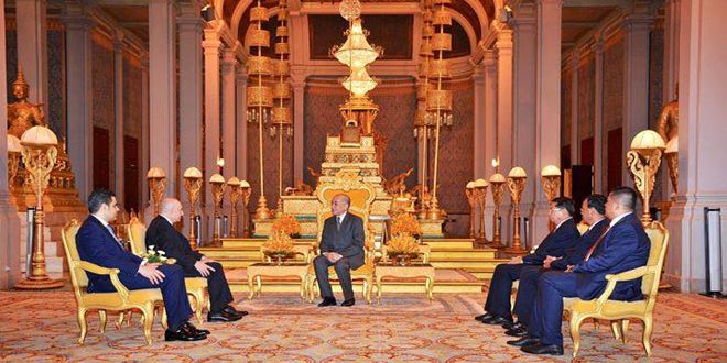 تقبل الملك الكمبودي نوردوم سيهاموني أوراق اعتماد السفير عماد مصطفى سفيرا غير مقيم للجمهورية العربية السورية لدى مملكة كمبوديا خلال استقباله في القصر الملكي بالعاصمة بنوم بنه.