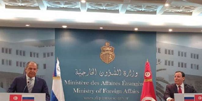 وقال لافروف خلال مؤتمر صحفي مع نظيره التونسي خميس الجيهناوي في العاصمة تونس اليوم ..متفقون على ضرورة إيجاد حل سياسي للأزمة في سورية وتسهيل عودة المهجرين السوريين إلى وطنهم.