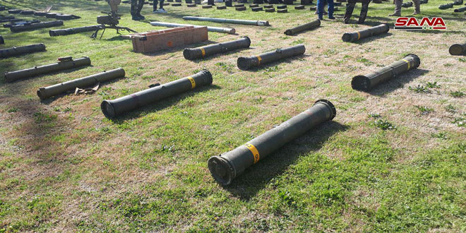 خلال مواصلة الجهات المختصة أعمال تمشيط المناطق التي طهرها الجيش العربي السوري من الإرهاب عثرت على كميات من الذخائر والأسلحة المتنوعة بينها صواريخ “تاو” أمريكية الصنع من مخلفات التنظيمات الإرهابية في أرياف درعا ودمشق وحمص.