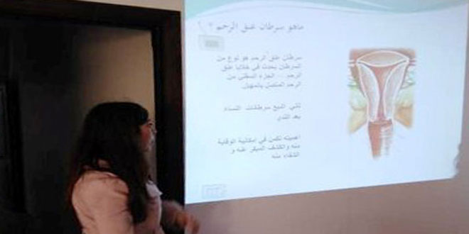 ففي حمص نظم مركز الاغاثة والتنمية في منطقة وادي النضارى محاضرة أوضحت خلالها اختصاصية أمراض وأورام الدم الدكتورة دينا ابراهيم أن الوقاية من المرض تكون عبر تطعيم الفتيات بين 9 و12 عاما ضد فيروس الورم الحليمي البشري المسؤول عن معظم حالات سرطان عنق الرحم وإجراء فحص اللطاخة دوريا بعد الزواج.