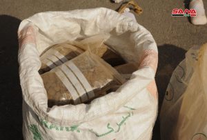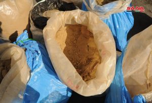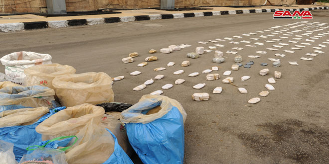 وذكر مصدر في الجهات المختصة في تصريح لمراسل سانا أنه “من خلال المتابعة الدقيقة وبناء على معلومات استخبارية وتحريات ميدانية وبالتعاون مع الأهالي الشرفاء تمت مداهمة إحدى المزارع على الحدود الإدارية بين محافظتي ريف دمشق وحمص وبتفتيش المزرعة تم العثور على كميات من الحبوب المخدرة ومادة الحشيش مطمورة تحت التربة وهي معبأة بأكياس من النايلون السميك لحمايتها من الرطوبة”.
