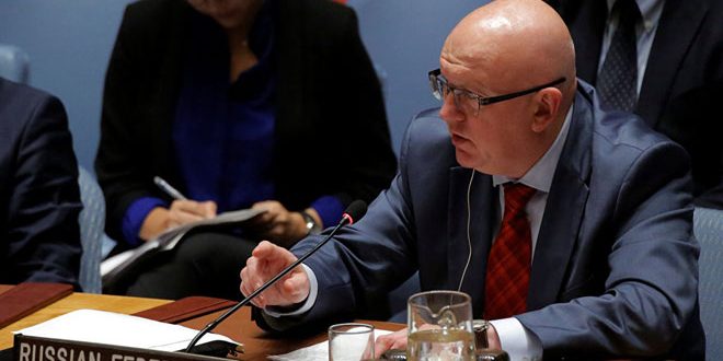 أكد مندوب روسيا الدائم لدى الأمم المتحدة فاسيلي نيبنزيا أن السبيل الوحيد لإعادة الاستقرار في سورية هو إعادة جميع المناطق إلى سلطة الدولة السورية داعياً إلى رفع الإجراءات الاقتصادية القسرية أحادية الجانب المفروضة على الشعب السوري.