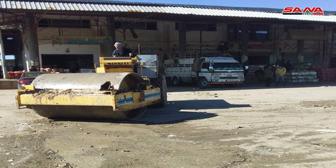 وأوضح المهندس ثائر جعفر رئيس دائرة الصيانة في مجلس المدينة في تصريح لـ سانا: أن ورشات الصيانة تعمل على وضع معالجة إسعافية للطرق ضمن السوق بمادة “القشط الزفتي” المتوافرة حالياً وذلك لتسهيل حركة نقل الخضار والفواكه في السوق.