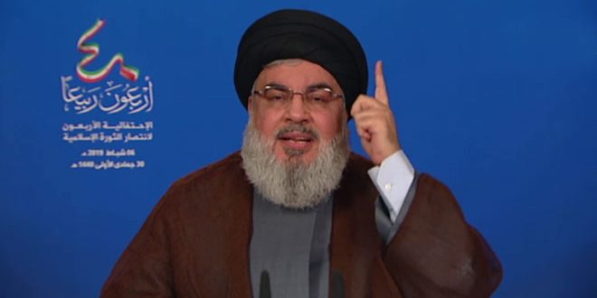 وقال نصر الله في كلمة له اليوم بمناسبة الذكرى الأربعين لانتصار الثورة الإسلامية الإيرانية:”إن أميركا إلى المزيد من الخروج من المنطقة وإسرائيل إلى المزيد من الخوف والهلع” لافتا إلى أن إيران لن تكون وحدها في حال فكرت الولايات المتحدة بشن حرب ضدها.