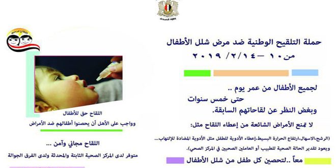 يذكر أن سورية أعلنت للمرة الأولى خالية من شلل الأطفال عام 1995 ليعود عام 2013 عبر عدة اصابات بالفيروس البري الباكستاني المنشأ حملته المجموعات الإرهابية المسلحة فأطلقت وزارة الصحة على أثرها سلسلة حملات تلقيح وطنية نجحت في قطع سراية الفيروس ولم يبلغ عن أي حالة جديدة منذ بداية عام 2014 لكن المرض عاد في حزيران عام 2017 بعد تسجيل إصابات بالفيروس المتحور في دير الزور لتتابع بعدها الوزارة حملات التلقيح التي وصلت حتى اليوم إلى 29 حملة وطنية.