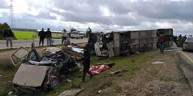وبين الملازم نمير حسن رئيس مركز شرطة الصنمين في تصريح لمراسلة سانا أن حافلة ركاب تحمل لوحة سعودية كانت تسير بسرعة كبيرة على الأتوستراد الدولي دمشق درعا اصطدمت بسيارة سياحية من نوع جيلي بداخلها عائلة كاملة عند مفرق بلدة تبنة ما أدى إلى تدهور السيارة وانقلابها ووفاة 6 أشخاص من ركابها بينهم طفلتان صغيرتان بينما نجت طفلة صغيرة ونقل مصاب آخر إلى العناية المشددة في مشفى الصنمين العسكري ووضعه مستقر الآن.