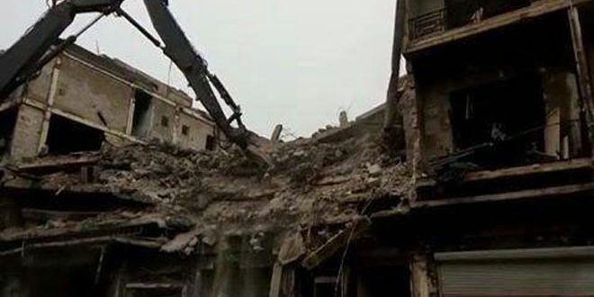باشر مجلس مدينة حمص بالتعاون مع فرع حمص للشركة العامة للطرق والجسور أعمال هدم البناء الآيل للسقوط الواقع في شارع النوري والتابع لمديرية أوقاف حمص.