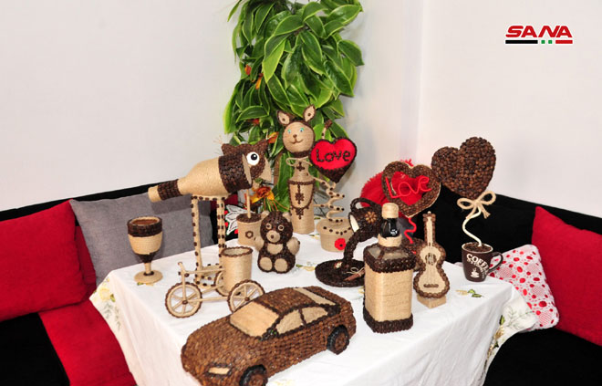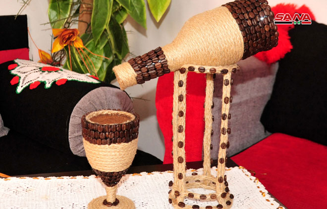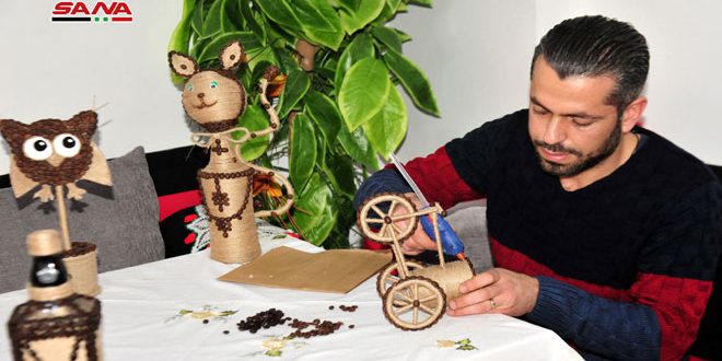 تحف فنية مبتكرة يصممها الشاب رائد زين الدين من حبات القهوة وخيوط الخيش موظفا حسه الفني وما اختزنه من أفكار ومهارات لإغناء تجربته وتقديم أعمال تحمل بصمة جمالية وأسلوبا خاصا يجسد حرفيته وإبداعه ويحقق له في الوقت ذاته دخلا إضافيا.