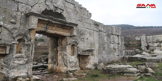 وأشار إلى أن المعبد وفق بنائه الحالي يعود إلى القرنين الثاني والثالث الميلاديين ويستدل من النقوش والكتابات اليونانية واللاتينية المكتشفة فيه على أنه معبد للإله زوس وتتضمن الكتابات رسائل من القيصر إلى حاكم الولاية تتعلق باحترام الامتيازات التي منحها الملوك السلوقيون وصرف الإيرادات للمعبد والإعفاءات الضريبية لسكان الموقع وعقد سوق تجارية مرتين في الشهر.