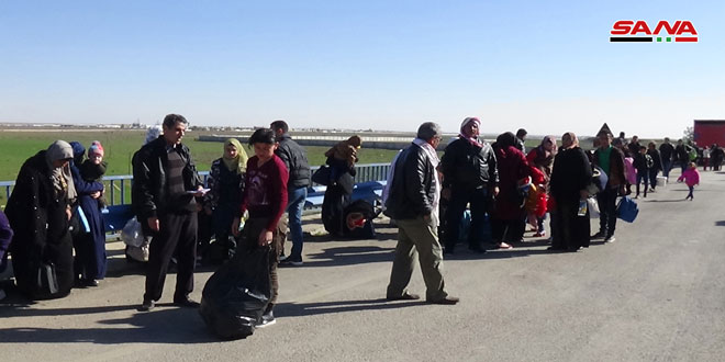 وذكر مراسل سانا من المعبر أن عدداً من الأسر تضم عشرات الأفراد معظمهم نساء وأطفال عادوا اليوم من مخيمات اللجوء في الأردن إلى الوطن مصطحبين معهم أمتعتهم الشخصية تمهيداً لنقلهم إلى منازلهم ومناطقهم المحررة من الإرهاب.