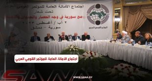 جددت الأمانة العامة للمؤتمر القومي العربي وقوفها وتضامنها مع سورية في مواجهة ما تتعرض له من استهداف وتآمر أمريكي غربي إقليمي واعتداءات إسرائيلية.