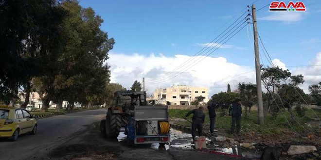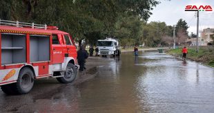 رئيس دائرة الصيانة في مديرية الخدمات والصيانة بمجلس المدينة المهندس سائر جعفر بين لـ سانا أن الورشات عملت على ضخ المياه بالتعاون مع فوج الاطفاء والدفاع المدني إلى الطرف المقابل من الشارع للاستفادة من تصريف المياه عبر الفوهات المطرية على جانبي الطريق في إطار تسريع عملية المعالجة اضافة الى استخدام تركسات وبواكر لفتح مسارب لتصريف المياه المتجمعة في الأراضي الزراعية المجاورة وحول البيوت السكنية بما يخدم عابري الطريق واهالي المنطقة المحيطة.