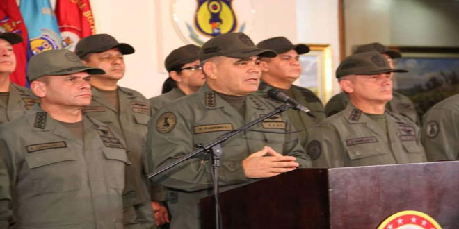 ونقلت /ا ف ب/ عن وزير الدفاع فلاديمير بادرينو قوله اليوم: “أن الجيش سيبقى على انتشاره وبحالة تأهب على طول الحدود لمواجهة أي خرق لسيادة الاراضي” مضيفا: إن الجيش “يدين بالولاء الذي لا يتزعزع للرئيس مادورو”.