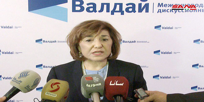 وقالت شعبان في تصريح لوسائل الإعلام السورية في موسكو اليوم على هامش الدورة الثامنة لمؤتمر فالداي للحوار الدولي: “تمكنا من إبراز وجهة نظر سورية والضيم الذي حصل عليها خلال السنوات الثماني الماضية والدور الذي تلعبه الولايات المتحدة وحلفاؤها في إطالة أمد الحرب على سورية عبر دعم الإرهاب وعدم التوصل إلى حل سياسي للأزمة فيها” مشيرة إلى أن الدورة الحالية لفالداي من أهم المؤتمرات نظرا لمشاركة العشرات من مراكز الأبحاث والدبلوماسيين والمفكرين.